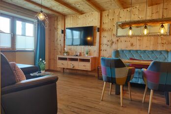 Diese tolle 2-Zimmer-Ferienwohnung wurde komplett neu gestaltet und es kamen neben sehr viel Zirben-holz ausschließlich hochwertige Naturbaustoffe für Böden, Decken und Wände zum Einsatz.